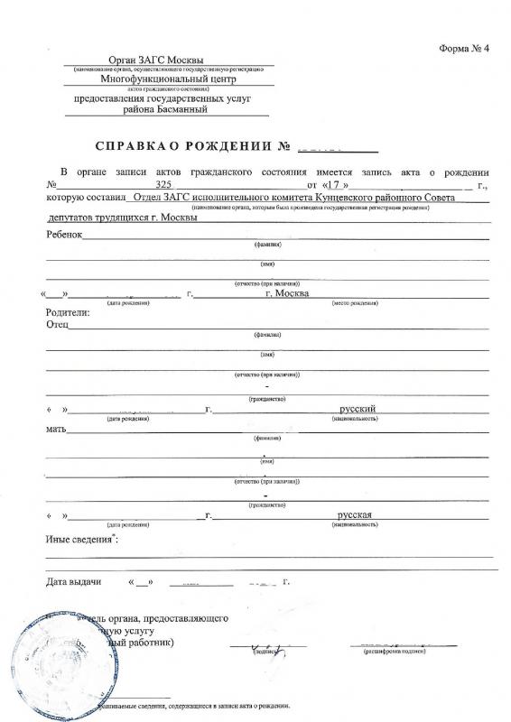 Чтобы оформить справку о рождении (форма № 4), необходимо предоставить: