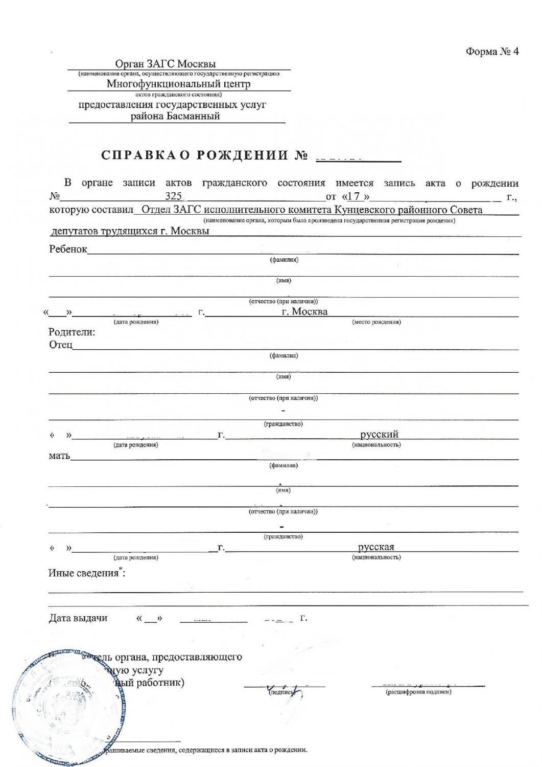 - Опытные специалисты в оформлении справок форма № 4 (о рождении)