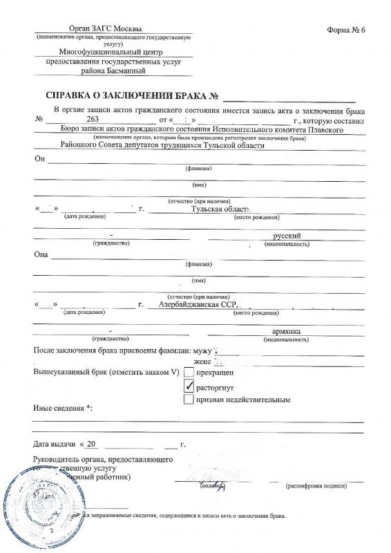 Собранные документы нужно предоставить в ЗАГС, где был зарегистрирован брак, для оформления справки. Сэкономить время можно, если купить справку формы № 6 в нашей компании.
