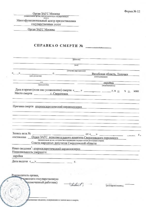 Для получения формы № 12 (о смерти) обратитесь в ЗАГС. Этот орган занимается регистрацией событий, связанных с гражданским состоянием, и выдает необходимые подтверждающие документы. Обратиться можно в ближайшее отделение по месту жительства умершего или по месту события. При себе следует иметь все требуемые документы.