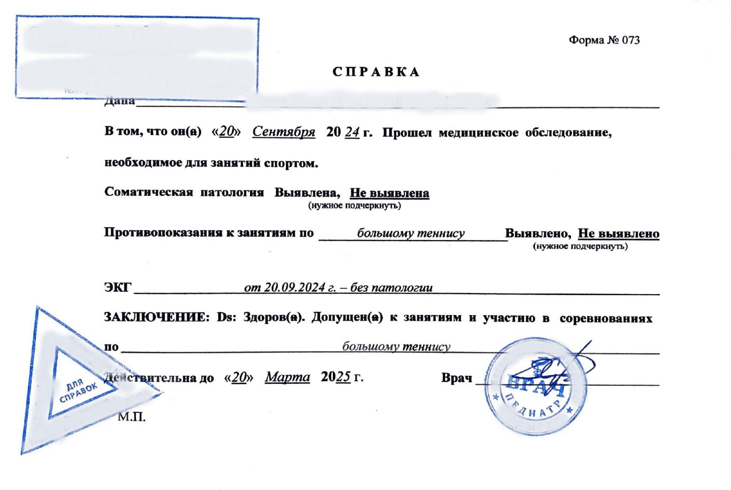 Справка для спортзала взрослому