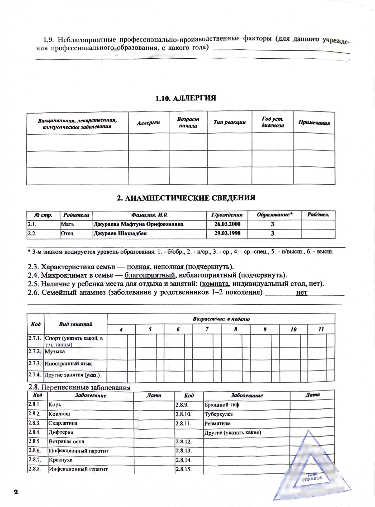 Кроме сведений о физическом здоровье ребенка медицинская карта должна содержать информацию о его психологическом состоянии, его способности быстро найти общий язык со сверстниками. Также в справке должны быть указаны ФИО родителей, их возраст и образование, а также данные об отношениях в семье.